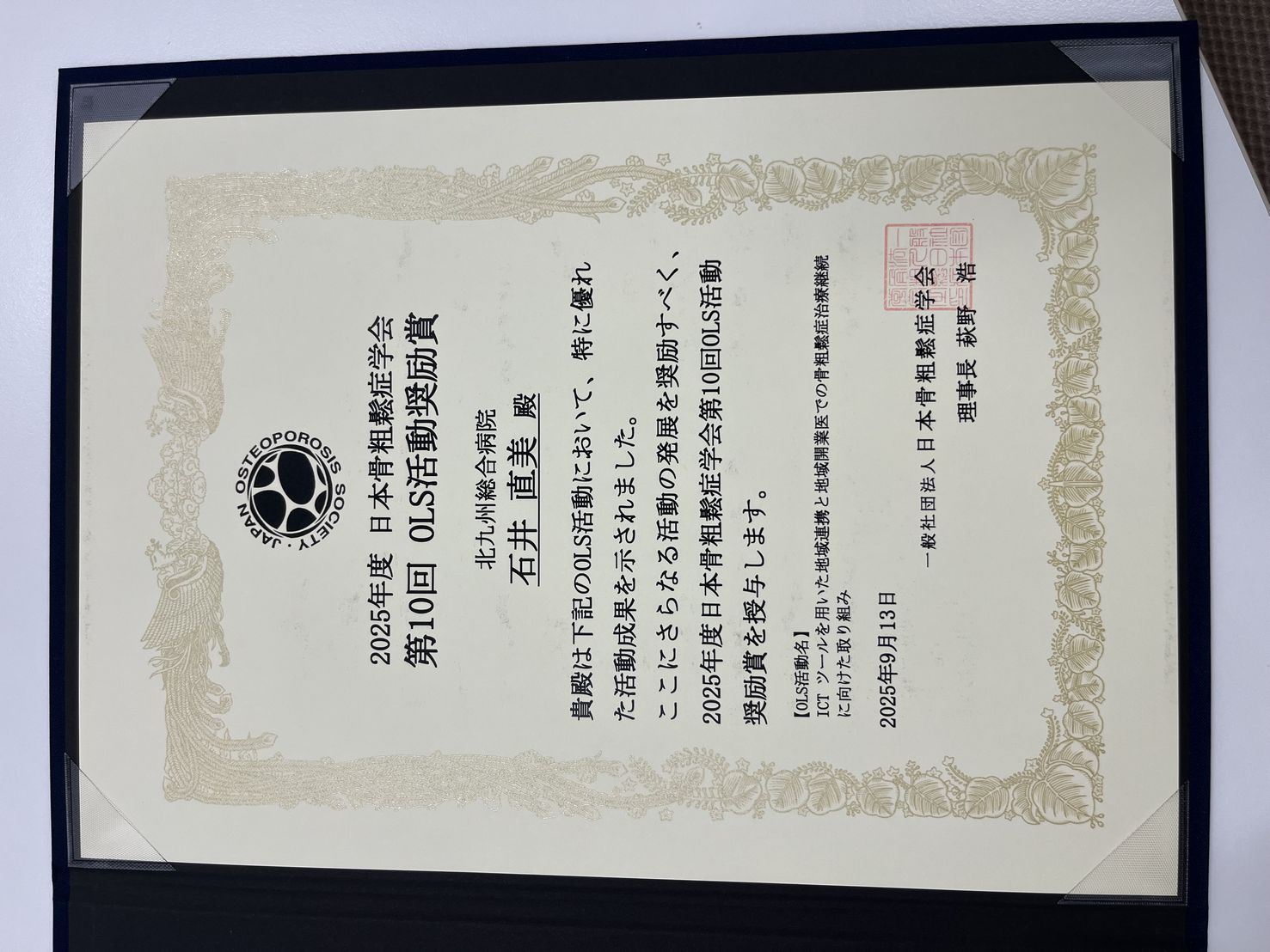 第27回日本骨粗鬆症学会にて第10回OLS活動奨励賞を受賞しました