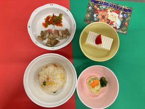 ・ピラフ ・照り焼きチキン ・付合せ ・ポテトサラダ ・クリスマスケーキ |