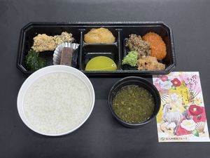 ・ご飯 ・雑煮風 ・菊花かぶ風 ・黒豆 ・胡麻和え ・絵馬かまぼこ ・市松ようかん ・煮合わせ ・味噌松 |